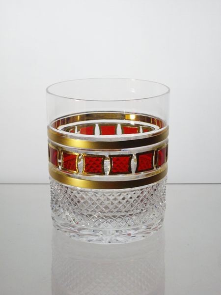 Coffret de 6 verres à whisky. Collection l'Or Rouge. Soufflés et décorés à la main. Cristal de Bohême agrémenté d’une teinture de couleur rouge et d’un pourtour en or 12 ct. Cette collection réunit couleur et beauté, offrant un service à verres dynamique et coloré.