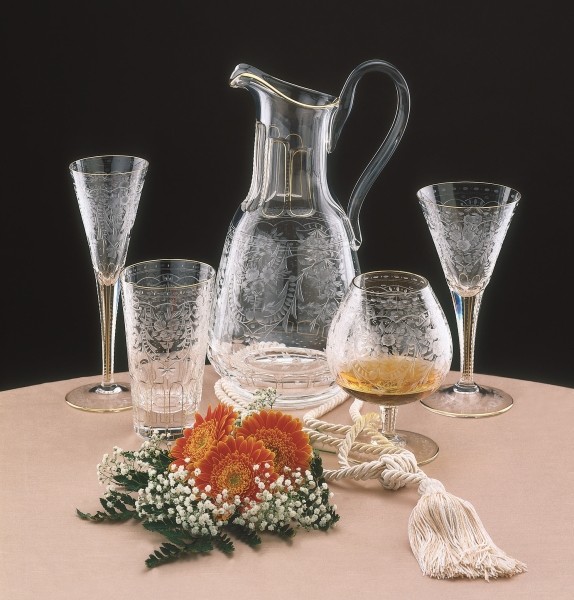 Verres soufflés à la bouche réalisés en cristal sans plomb gravés et décorés à la main. Imaginée en 1895, Maharani est l’une des collections les plus connues des prestigieuses cristalleries Moser. Chaque verre est superbement gravé à la main avec d’incroyables détails puis doré à l’or 24 carats pour créer un magnifique chef d’œuvre en cristal.