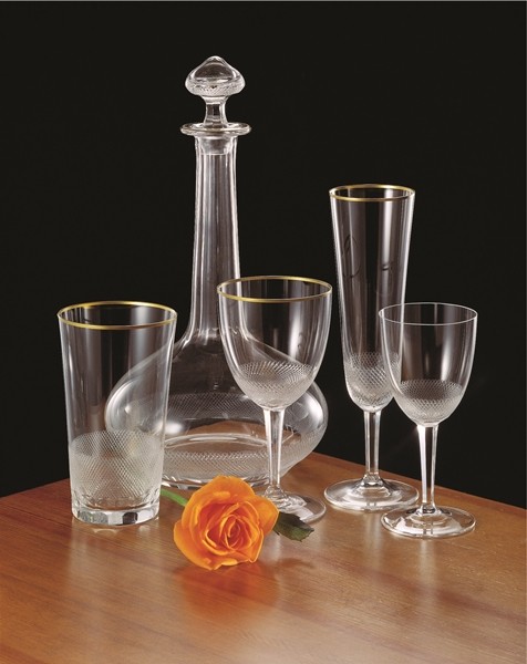 Verres soufflés à la bouche réalisés en cristal sans plomb gravés et décorés à la main. La collection Royale présente une taille délicate en forme de diamant à la base ornée d’une bordure en or 24 carats. Conçue par les fameuses cristalleries Moser, il s’agit de l’une des marques de cristal les plus raffinées et les plus collectionnées.